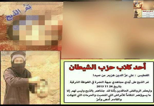 برخی از سایت های تابع جبهه النصره تصویر ذبح و بدن بدون سر یکی از رزمندگان حزب الله لبنان را بر روی صفحه خود قرار داده اند. در ذیل تصویر با لحنی بسیار توهین آمیز نوشته شده: