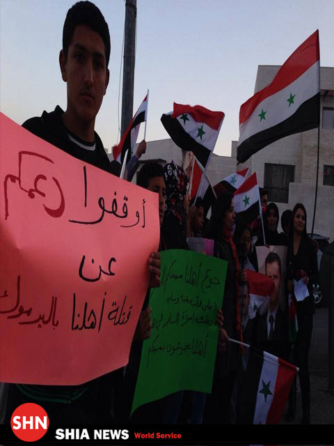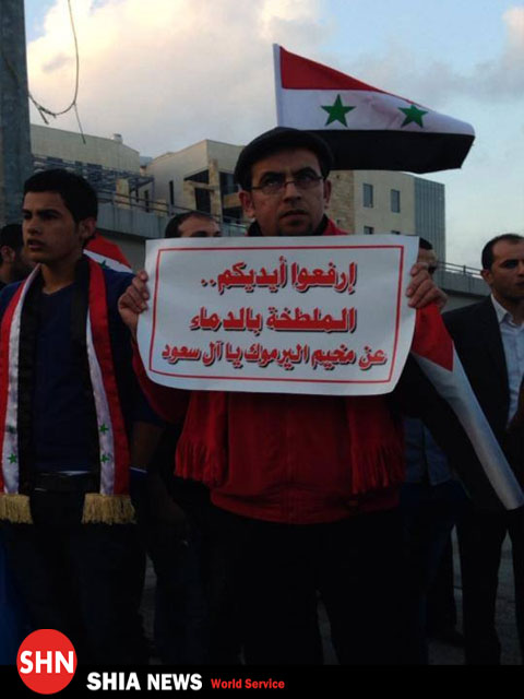 تظاهرکنندگان در شعارهایی خطاب به آل سعود از این دولت خواستند هر چه زودتر از این اعمال در سوریه دست بردارد، و از پشتیبانی مالی، تسلیحاتی و آموزشی از تروریست ها در سوریه و نیز تجهیز برخی از افراد در اردوگاه یرموک منصرف شود و راه رساندن مواد غذایی و دارویی به این اردوگاه را باز نماید، همانگونه که وضعیت دیگر مناطق سوریه که تحت تسلط گروه های تکفیری وهابی است بهتر از این اردوگاه نیست .