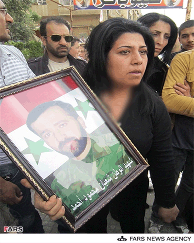 3. زن دیگری هم کمی ان‌طرف‌تر هست او تنها عکس یک شهید را دستش گرفته کمتر کسی به او توجه دارد؛ برخی سوری‌ها دیگر بیش از حد برای بشار اسد شعار می‌دهد؛ این زن را اصلا ندیده بودم بعدها در عکس‌هایی که گرفتم می‌بینم که او پشت آن پیرزن ایستاده بود.