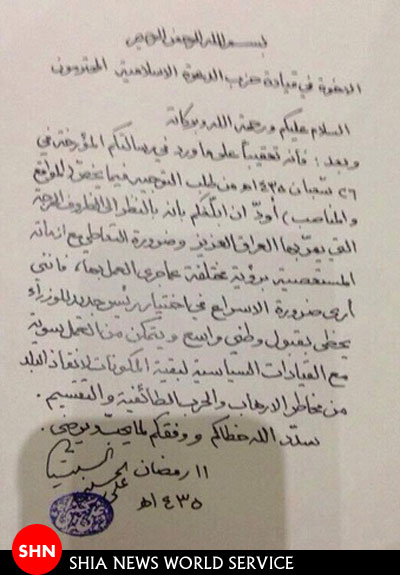 اما بعد متعاقباً در پاسخ به آنچه در نامه شما به تاریخ ۲۶ شعبان ۱۴۳۵ هـ در زمینه (پست ها و مناصب) باید به شما ابلاغ کنم که با توجه به شرایط بحرانی موجود در عراق عزیز و ضرورت تعامل با بحران‌های گریبان‌گیر آن با دیدگاه متفاوت از آنچه در کشور جاری است من ضروری می‌بینم که در جهت انتخاب نخست‌وزیر جدیدی که از موافقت و اجماع ملی برخوردار باشد و بتواند با رهبران سیاسی و دیگر گروه‌ها کشور را را از تهدیدهای تروریستی و جنگهای طوائفی وتقسیم نجات دهد تسریع شود.