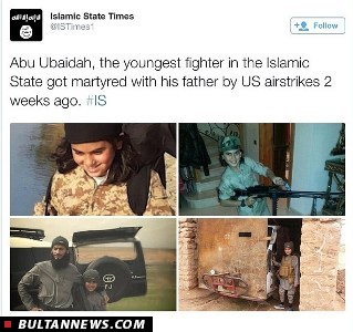 به گزارش «شیعه نیوز»، گروه موسوم به دولت اسلامی داعش تصاویر و خبر کشته شدن یک پسربچه 10 ساله را منتشر کردند که گویا در درگیری های اخیر همراه با پدرش در سوریه کشته شده است. رسانه های داعش اعلام کردند که به دلیل حملات هوایی جنگنده ها این پسر و پدرش کشته شدند و همین نیز سبب شد تا کوچکترین و کم سن و سال ترین عضو این گروه در حولات اخیر کشته شود.