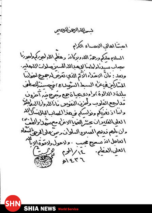 SHIA-NEWS.COM شیعه نیوز:به گزارش «شیعه نیوز»، آیت الله سید علی سیستانی با صدرو بیانیه ای به خانواده های شهدای حسینیه شیعیان "احساء" که در روز عاشورا به دست عده ای ناشناس به شهادت رسیدند، تسلیت گفت. در این حمله 7 شیعه به شهادت رسیدند و 12 نفر دیگر مجروح شدند.