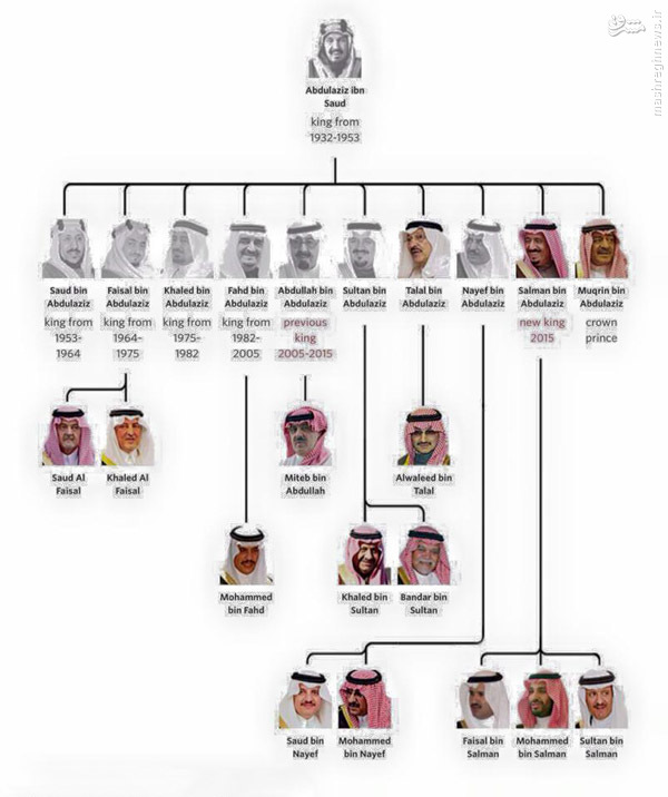 در تصویر زیر شجره فرزندان ملک عبدالعزیز و عمر و مدت زمان حکومت هریک را مشاهده می‌کنید.