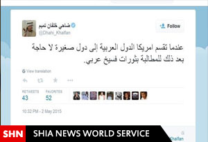 به گزارش «شیعه نیوز»، "ضاحی خلفان" روز یکشنبه در صفحه تویتر خود نوشت: وقتی آمریکا کشورهای عربی را به چند کشور کوچک تقسیم میکند، دیگر پس از آن نیازی به انقلابهای عربی نخواهد بود.