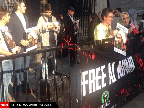 گروهی از فعالان حقوق بشر به نشانه همبستگی با شیخ نمر باقر النمر، روحانی شیعه زندانی در عربستان در لندن، پایتخت انگلیس تجمع اعتراضی برگزار کردند.
