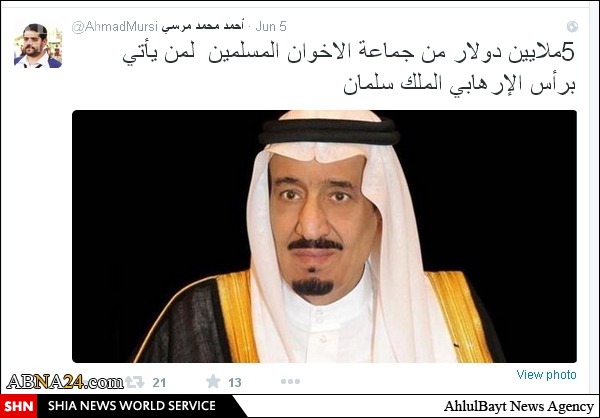 به گزارش«شیعه نیوز»، وی در صفحه توییتر خود نوشت: جماعت اخوان برای کسی که سر ملک سلمان تروریست رابیاورد پنج میلیون دلار جایزه تعیین کرده است.