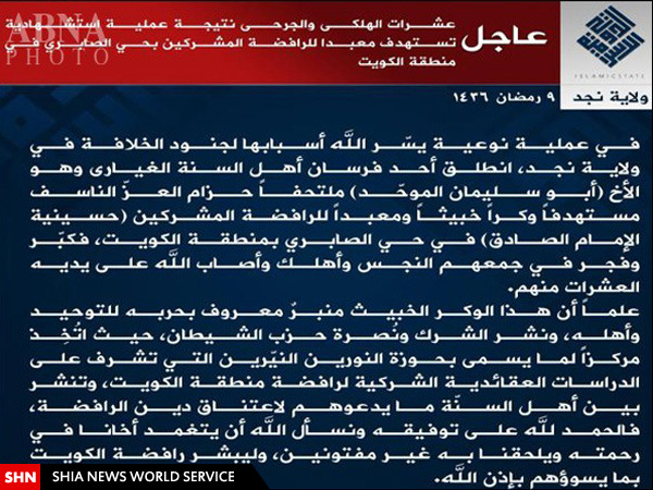 خداوند را به خاطر موفقیت او در این عملیات سپاس می گوییم و از خدا می خواهیم که برادرمان را در پناه رحمت خود قرار دهد و ما را نیز به او محلق کند. همچنین، به اذن خدا، رافضیان کویت (شیعیان) را به ادامه آنچه خوش نمی دارند بشارت می دهیم.»