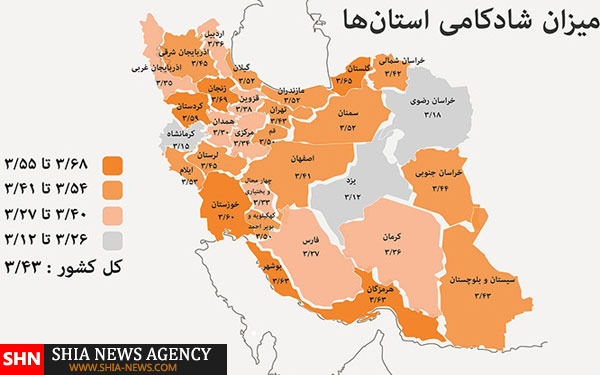 همچنین استانهای گلستان، بوشهر، هرمزگان و كردستان از میزان شادكامی بالاتری از خط میانگین برخوردار بودهاند.