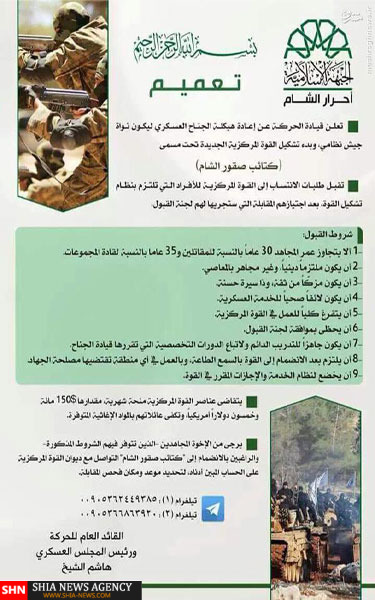 گروه تروریستی تکفیری "احرارالشام" وابسته به اخوان المسلمین سوریه روز گذشته بصورت رسمی برای جذب نیروهای جدید آگهی جذب منتشر کرده است.