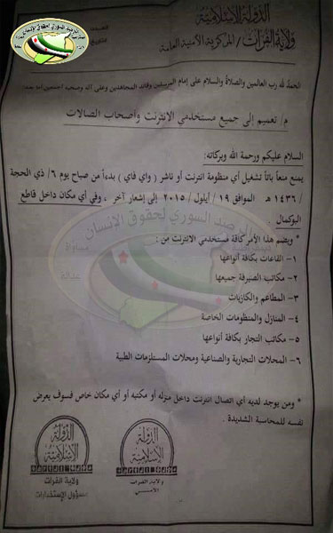 گروه تروریستی داعش با انتشار بخشنامه ای جدید، استفاده از اینترنت را در یکی دیگر از شهرهای سوریه ممنوع کرد.